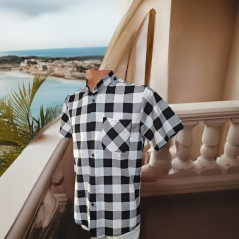 Biało-czarna koszula flanelowa B-27 z krótkim rękawem – 100% bawełny, przewiewna i stylowa. Świetna na letnie spacery, weekendowe wypady i casualowe stylizacje. Wyprodukowano w Polsce.